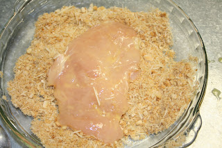 Start by pounding the chicken flat. I always put my chicken in a baggie to keep the chicken bits from flying all over my kitchen. Start in the thickest part of the breast and work your way out. I use the flat side of a meat mallet, you could use a rolling pin or maybe a cast iron skillet. This is a great meal to make after a particularly frustrating day...you can just take it out on the chicken...it doesn't care!!